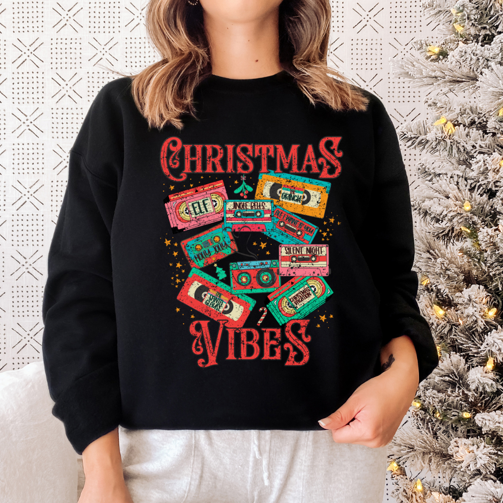 Get ready to press play on your holiday nostalgia with this "Christmas Vibes" sweatshirt! Featuring a fun mix of VHS tapes showcasing classic Christmas flicks like Elf, Christmas Vacation, and The Grinch, this sweatshirt is perfect for those who love their holiday movies with a side of retro charm. Cozy, playful, and packed with festive spirit, it's the ultimate way to rock those vintage vibes all season long. Pop some popcorn, grab your favorite holiday drink, and let the Christmas marathon begin!