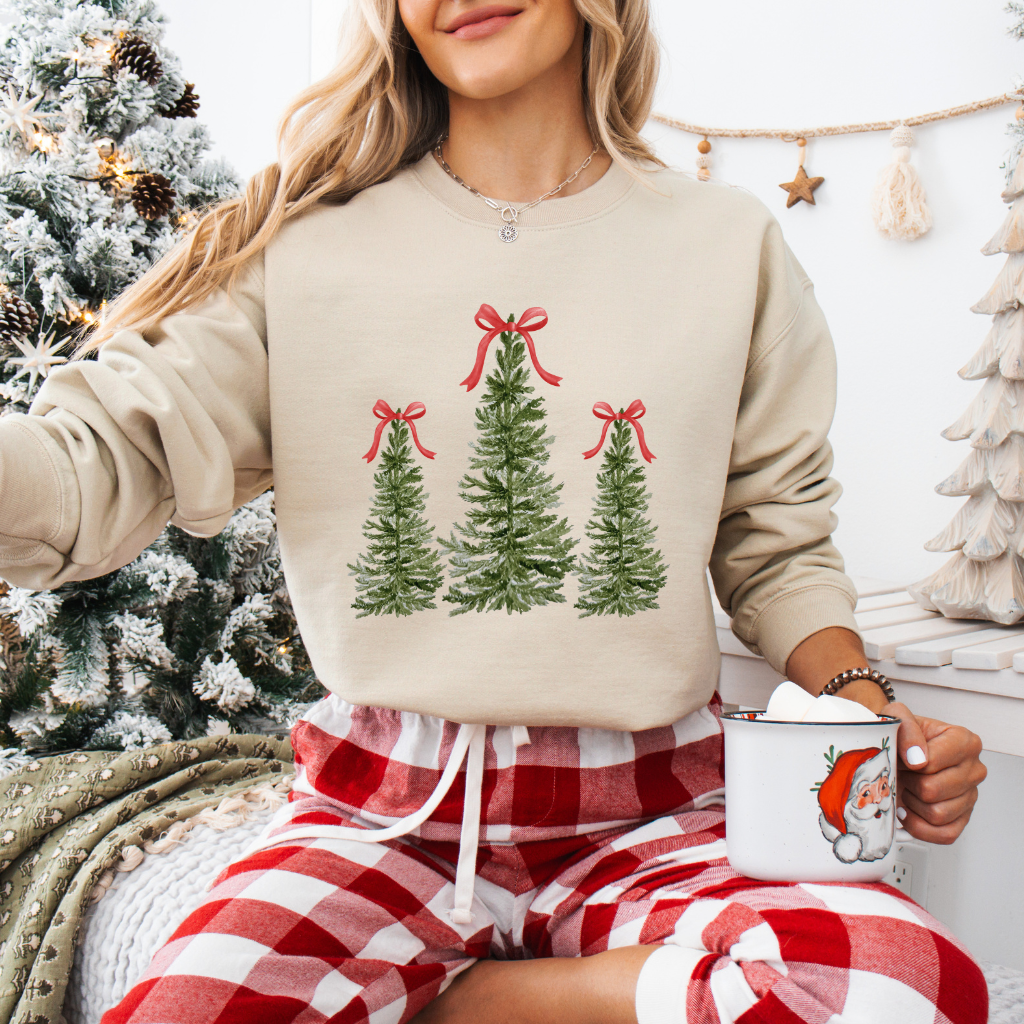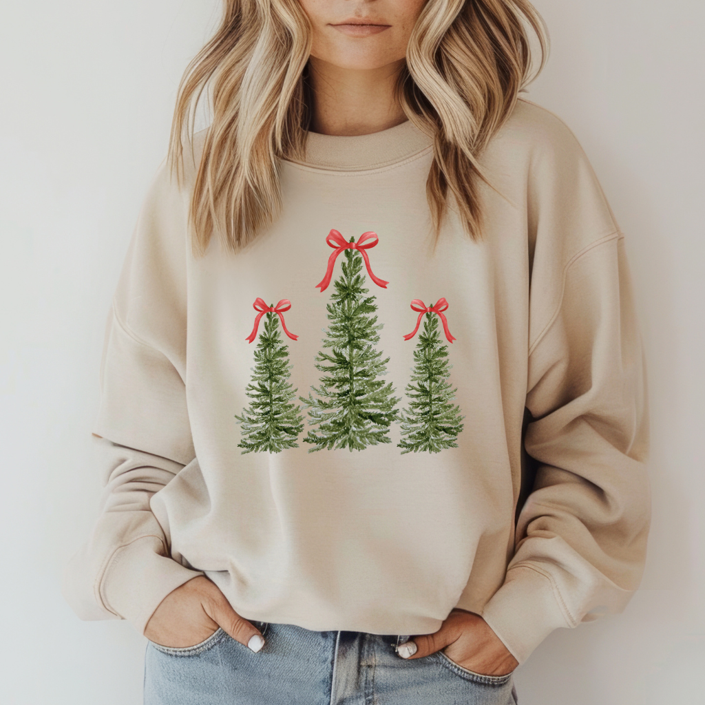 Dress up your holidays with a playful twist in this sweatshirt, featuring three darling Christmas trees adorned with coquette bows. Whether you're celebrating with loved ones or just getting into the holiday spirit, this sweatshirt brings a fun, flirty touch to your seasonal wardrobe—comfortably cute, all season long!